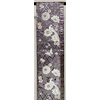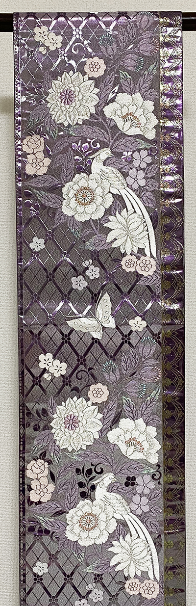 張りのある手触りで確りと打ち込まれた格子の地柄を織り込んだ紫の錦地織りに、花鳥や蝶などの柄を白や銀糸に青緑色や黄赤色のラメ糸などで重ね織りした品。