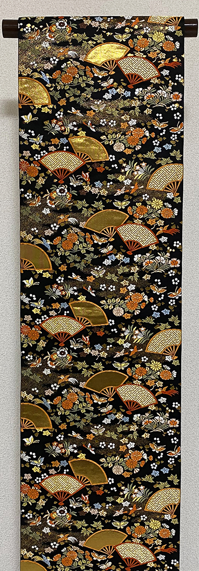 張りのある手触りで確りと打ち込まれた黒の錦地織りに、扇や花鳥蝶などの柄を黄赤色や薄紫色にウグイス色と金糸金箔などで重ね織りした品。