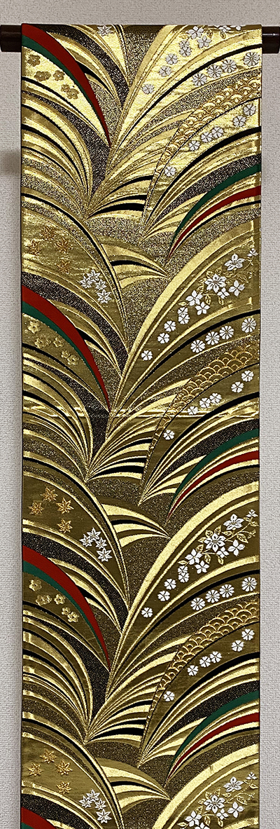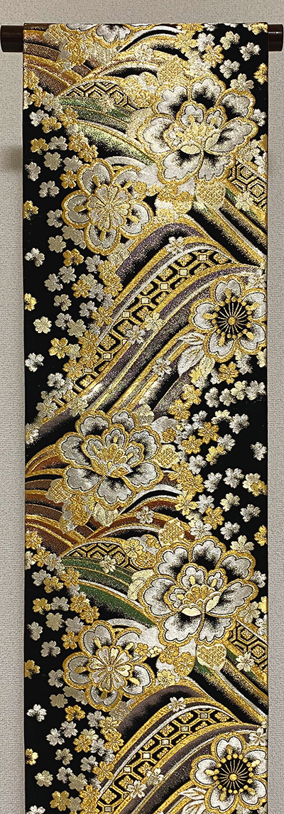 張りのある手触りで確りと打ち込まれた横糸に金糸を重ねた黒の錦地織りに、波と花などの柄を金銀に紫色や緑色などのラメ箔を加え重ね織りした、手先を変えることによって異なる柄を楽しめる品。手先を反対にすると、流水の柄を金銀糸で重ね織りした面を楽しむ事ができます。