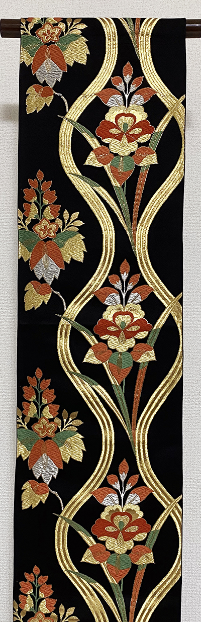 しなやかな手触りで確りと打ち込まれた黒の緞子地織りに、立涌に花の柄を金糸金箔と緑色や黄赤色などで重ね織りした品。