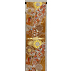 張りのある手触りで確りと打ち込まれた黄赤に金の引き箔を重ねた錦地織りに、熨斗に花などの柄を金銀糸に薄紫色や緑色と赤色などで重ね織りした品。