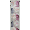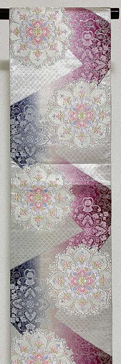しなやかな手触りで確りと打ち込まれた白や赤紫・墨色暈しの織り分けに、菱や蔓花の柄を銀の佐賀錦箔で重ねた錦地織りに、華紋柄をピンク色や水色などで重ね織りした品。