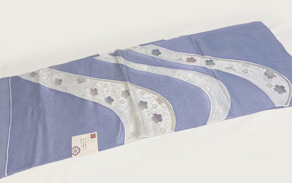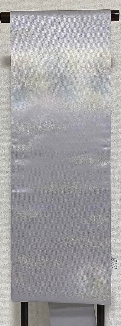 しなやかな手触りで小さな地柄を織り込んだ紋綸子の生地を淡い青紫に地染めし、波柄に小花の柄を白ネズやベージュ色と少しの金通しを加え重ね織りし、水色や薄い赤紫色で重ね染めした品。