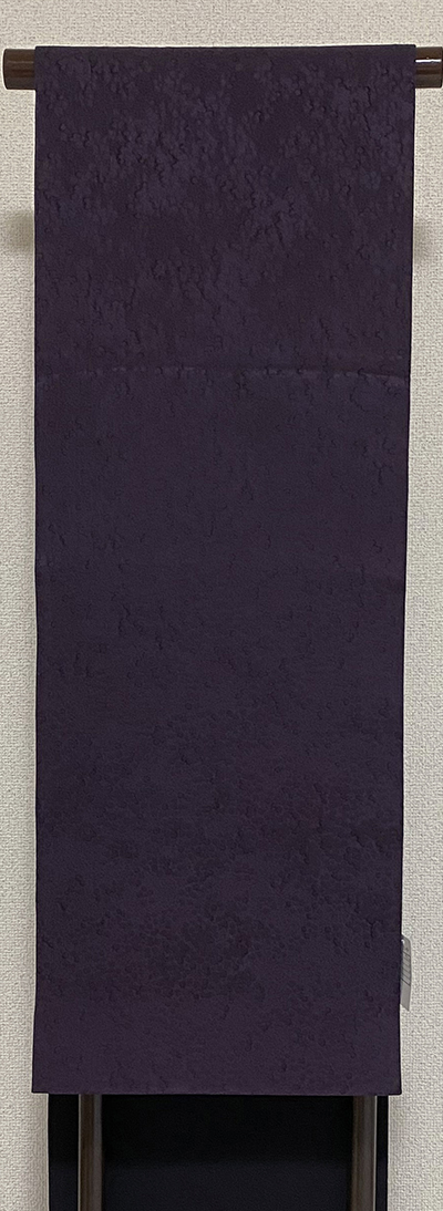 張りのある手触りで確りと打ち込まれた小さなアラレの地柄を織り込んだ紋意匠の生地をくすんだ深い紫色で染め上げた品。手先まで平仕立てで、正絹黒の裏地が付いた額縁仕立て。