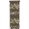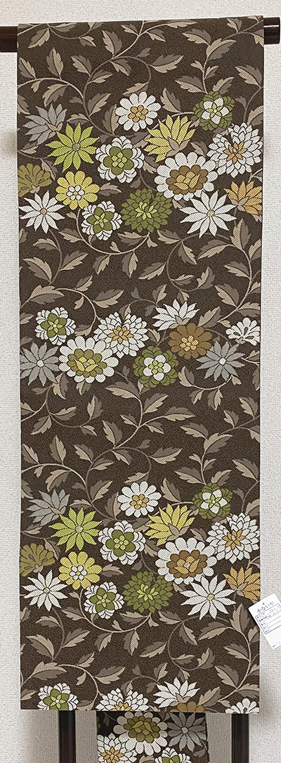 しなやかな手触りで確りと打ち込まれた小さな地柄を織り込んだ薄いこげ茶色の錦地織りに、蔓花の柄を薄小豆色や黄緑色に金茶色などに少しの金糸を加え重ね織りした品。