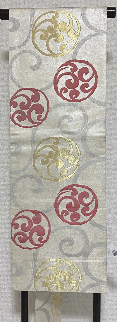 しなやかで張りのある手触りで確りと打ち込まれた淡いベージュ色の錦地織りに、蔓花の柄を金銀糸と銀箔・紅色などで重ね織りした品。