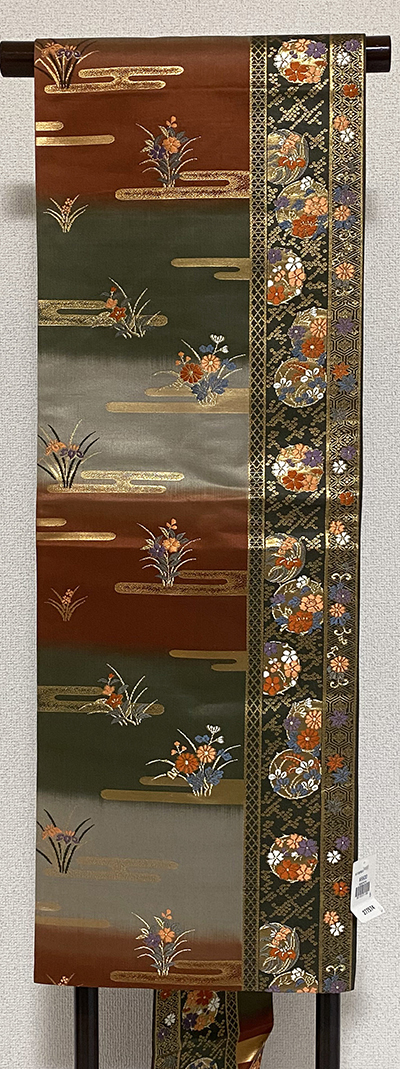 しなやかな手触りで確りと打ち込まれた薄緑色にエンジ色と青ネズの横段暈し錦の地織りに、花柄を金糸金箔と青ネズに紫色・エンジ色などで重ね織りした品。