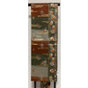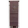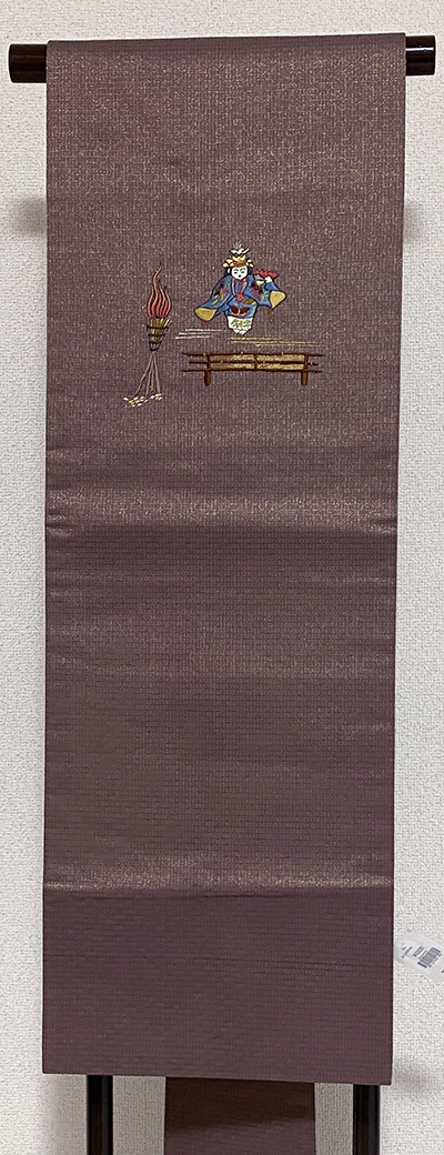 張りのある手触りで確りと打ち込まれた小さな格子柄を金糸で重ねたくすんだ薄小豆色の錦地織りに、お太鼓の人柄を青色や金茶色・黄赤色などに金銀糸を加えた刺繍で仕上げた品。