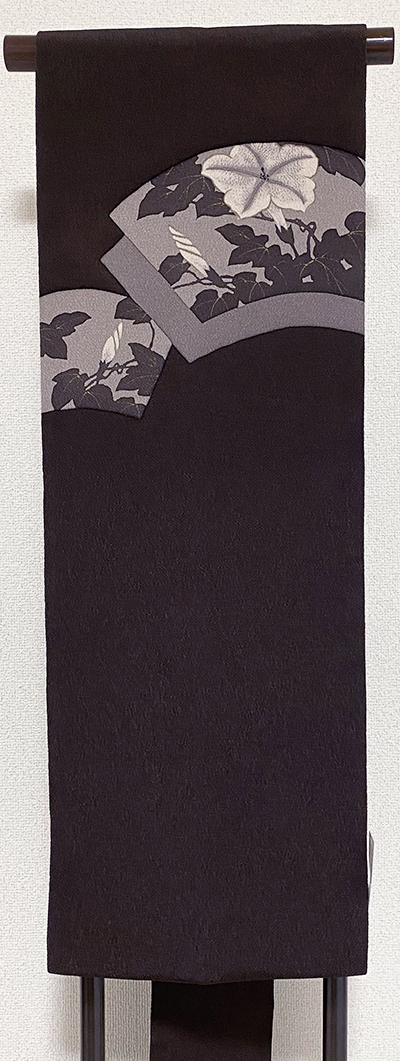 しなやかな手触りで確りと打ち込まれた上質な縮緬の生地を黒に近いくすんだ紫色の地染めし、お太鼓の扇面に朝顔などの柄を白ネズ濃淡と少しのカーキ色などで重ね染めした品。