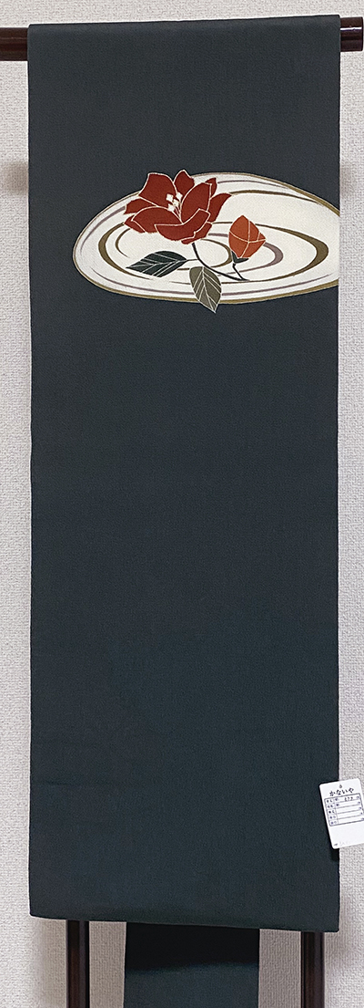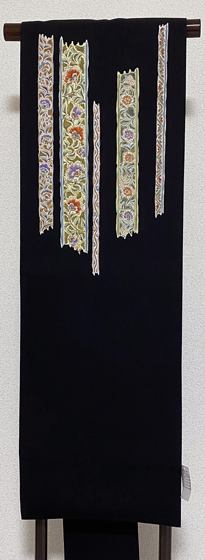 スベリの良い手触りで確りと打ち込まれた塩瀬の生地を黒に地染めし、短冊取り花柄をベージュ色や薄ローズ色と薄紫色・黄赤色などに少しの金彩を加え重ね染めした品。