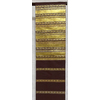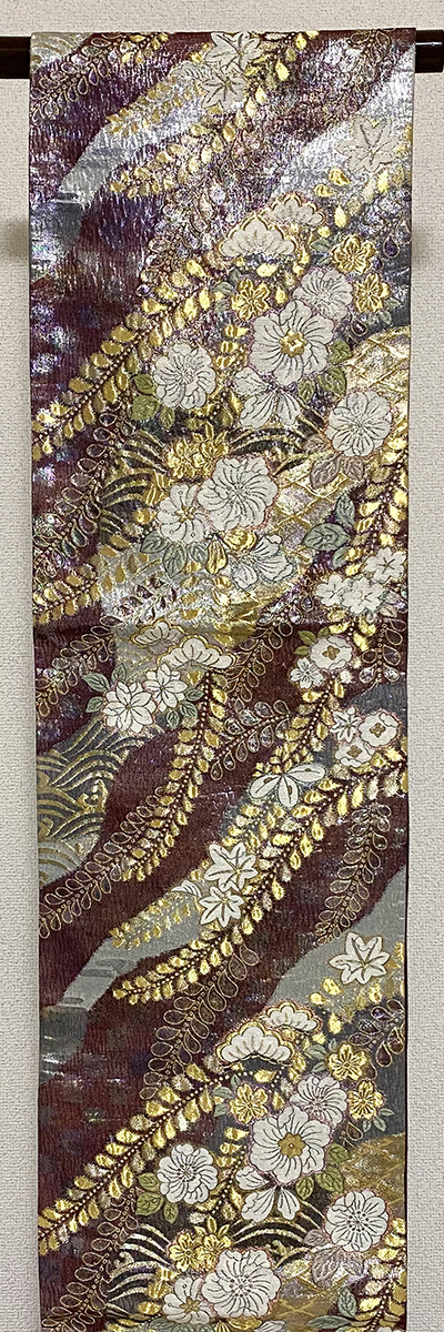 しなやかな手触りの本金箔間道錦織りで、くすんだ小豆色の地織りに、横段花柄を金糸金箔で織った品。