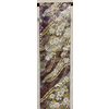 しなやかな手触りの砂子つづれ手織りで、くすんだベージュ色の地織りに金糸を霜降りに織り込み、お太鼓の花柄を紫色や金茶色に青緑色と金糸を加えてスクイ織りで織った品。