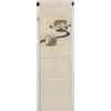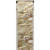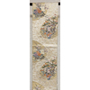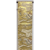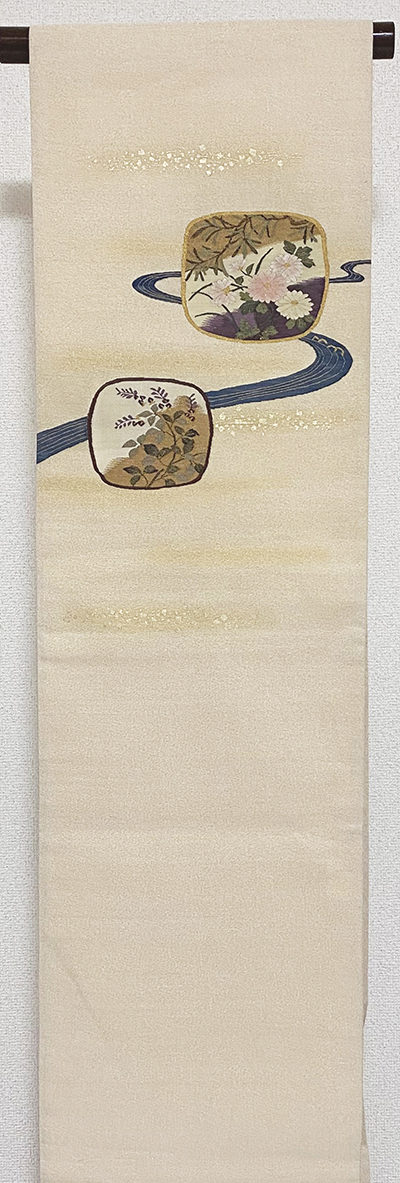 しなやかな手触りの紹巴織り錦織り生地で、くすんだベージュ色の地織りに、屏風絵巻花柄を金糸金箔と白ネズに黄赤色や水色などで織った品。