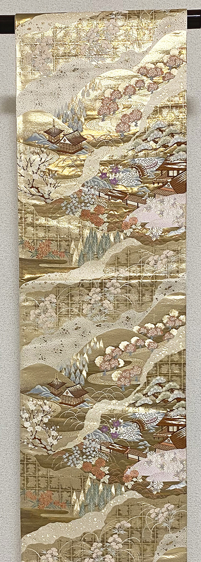 確りとした張りのある九百錦の地織りで、淡いベージュ色の上に、風景庭園柄を金糸金箔と紫色にエンジ色と白ネズなどで織った品。