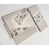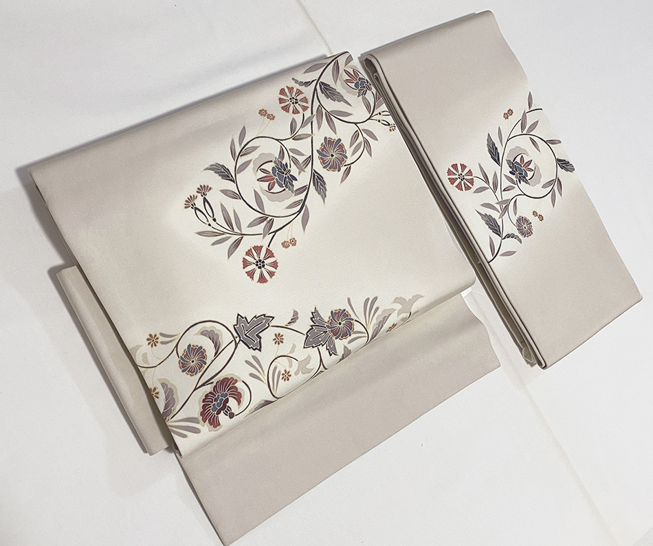 確りとした上質な塩瀬の生地で、白ネズ色に少しのくすんだベージュ色の地色に、蔓花の柄をこげ茶色や黄赤色に青ネズ色などで丁寧に染めた、お太鼓柄の品。
