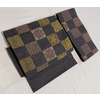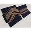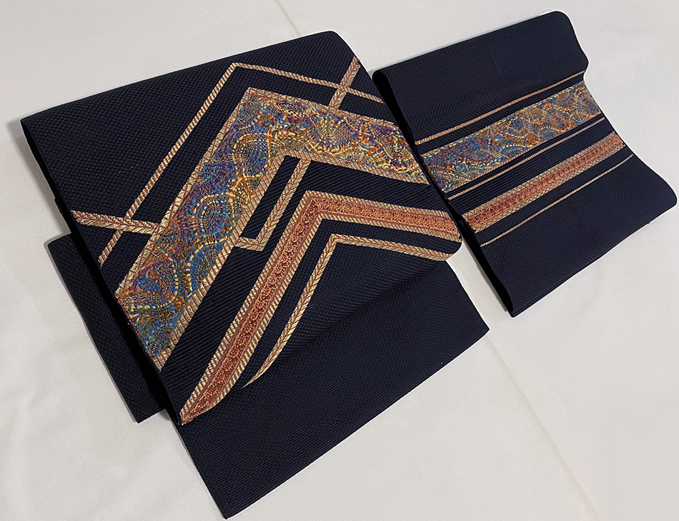 確りとした張りのある錦の織りで、黒の地織りを細かな市松に織り、お太鼓の柄を金糸と黄赤色で織り、青色や紫色に黄赤色などのリボン糸を加え織り上げた、お太鼓柄の品。