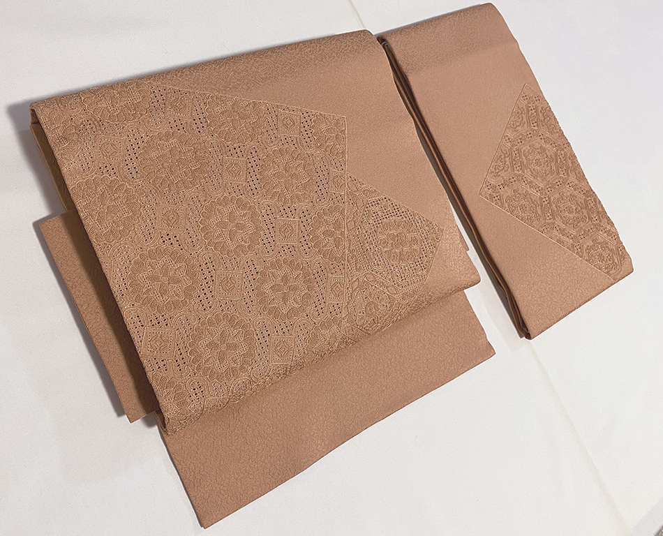 しなやかな手触りの霜降りに織られた紋意匠織り生地をくすんだ珊瑚色に染め、お太鼓の花柄を細かな相良刺繍とスワトウ刺繍で丁寧に仕上げた、お太鼓柄の品。