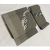 確りとした手触りの良い小さなフシを織り込んだ紬織り生地で、くすんだオリーブ色と緑みの灰色の濃淡で大きな縦縞に織り上げ、お太鼓の柄を白ネズ色や薄紫色と淡い珊瑚色などの相良刺繍と手刺繍に縁取りに金糸を加えて刺繍した、お太鼓柄の品。