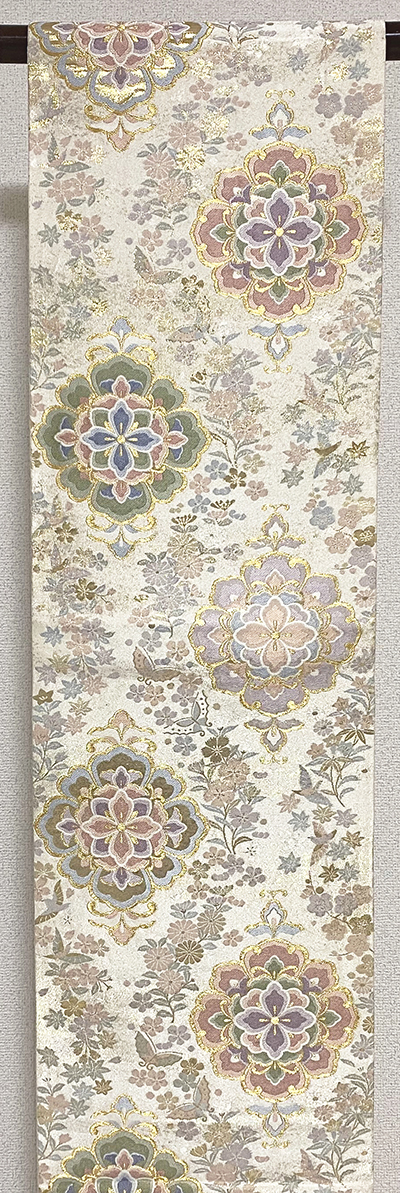 確りとした張りのある上質な錦の織りで、生成りの白に金糸を霜降りに織り込み、その上の花鳥柄を薄藤色にローズ色と緑色に金糸金彩を加えて上品に織り上げた品。