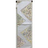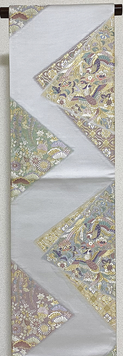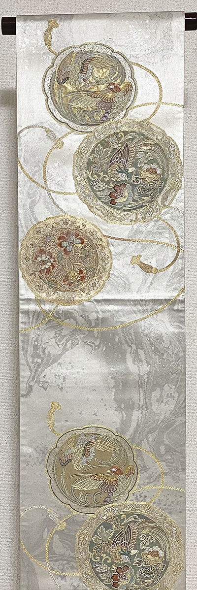 薄手で張りのある上質な錦の織りで、銀ネズ箔を墨流しに織り込んだ地織りに、鏡に紐柄を金糸金箔と黄赤色や緑色に紫色を加え、お太鼓の下にも柄を織り込んだ、三通柄の品。