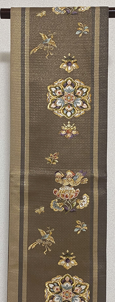 しなやかな手触りの柔らかい錦の織りで、金茶色とこげ茶色に金糸を霜降りに織り込んだ縞柄を全通に織り、その上の花鳥柄を唐織りを加え金糸と紫色に黄赤色や緑色などを加え織った品。