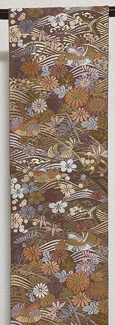 しなやかな手触りの柔らかい錦の織りで、くすんだ小豆色に地織りし、その上の花鳥柄と波柄を金糸と青ネズ色や薄紫色と黄赤色などで唐織りに織った品。