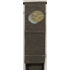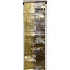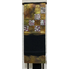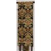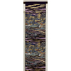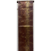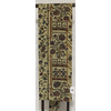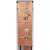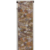 確りとした張りのある錦の織りで、くすんだ小豆色に地織りし、露芝と流水や横段雲の柄などを金糸金箔と青銅箔で織り、一部の唐織りには黄赤色や紫色と緑色などを加え織った品。タレ先の右側に紋(丸に五瓜に唐花)がカラフルに唐織りされています。