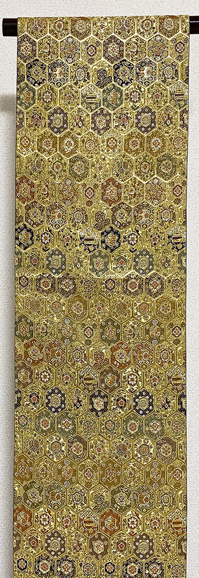 しなやかな良い手触りの金色に輝く錦の織りで、亀甲の中に小さな花柄をびっしりと織り込み、金糸金箔と小豆色や紫色に鉄紺色やエンジ色などで織った品。