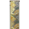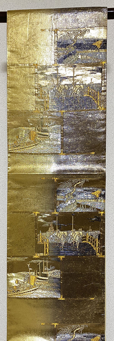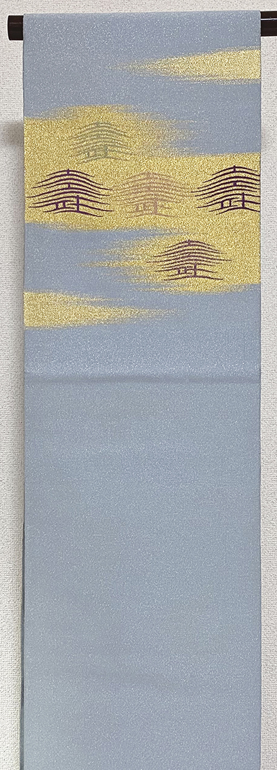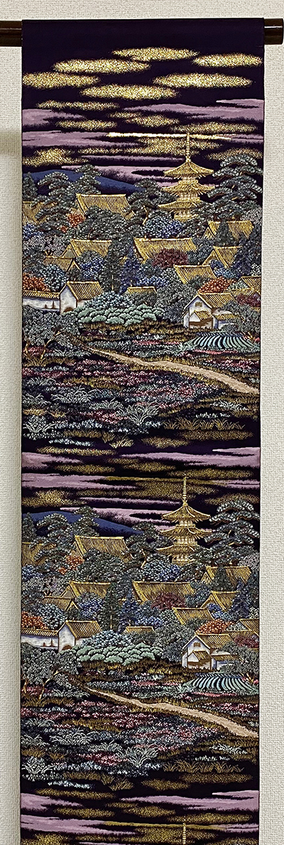 しなやかな手触りの錦の織りで、深い紫色の地織りに、風景や家に塔などの柄を金糸金箔に緑色や紫色と黄赤色などで織り、お太鼓の下にも同じ柄を織り込んだ、三通柄の品。前腹と手先の家や木立の柄は別織りになっています。タレに作家名と落款があります。