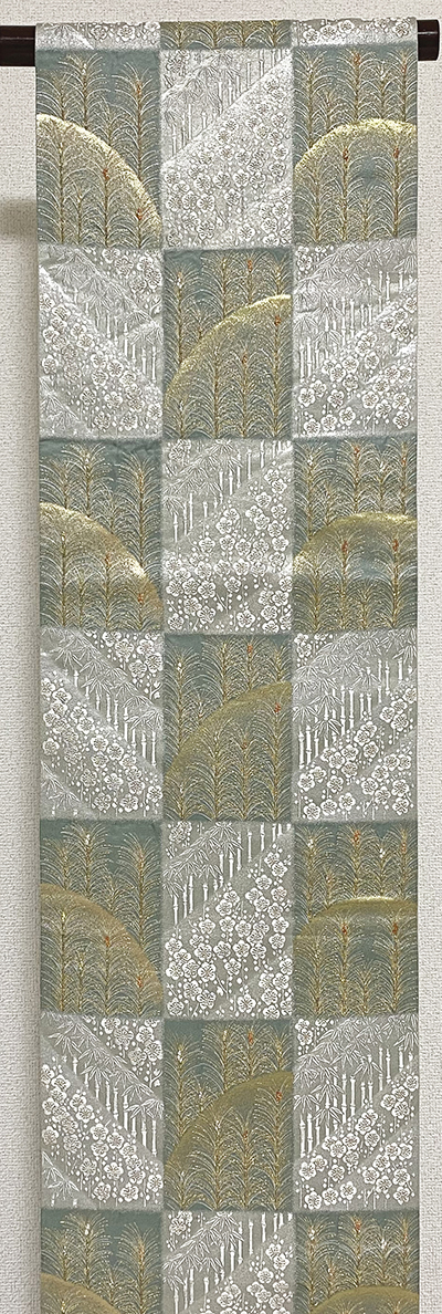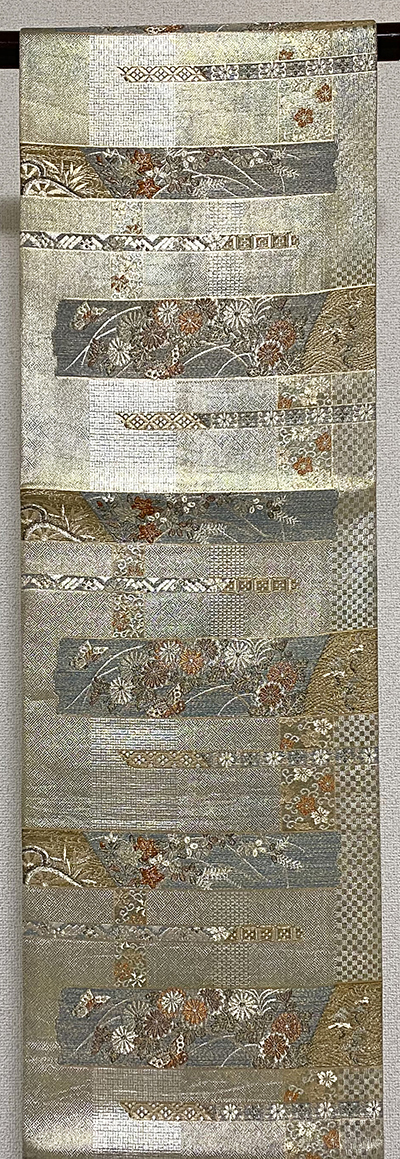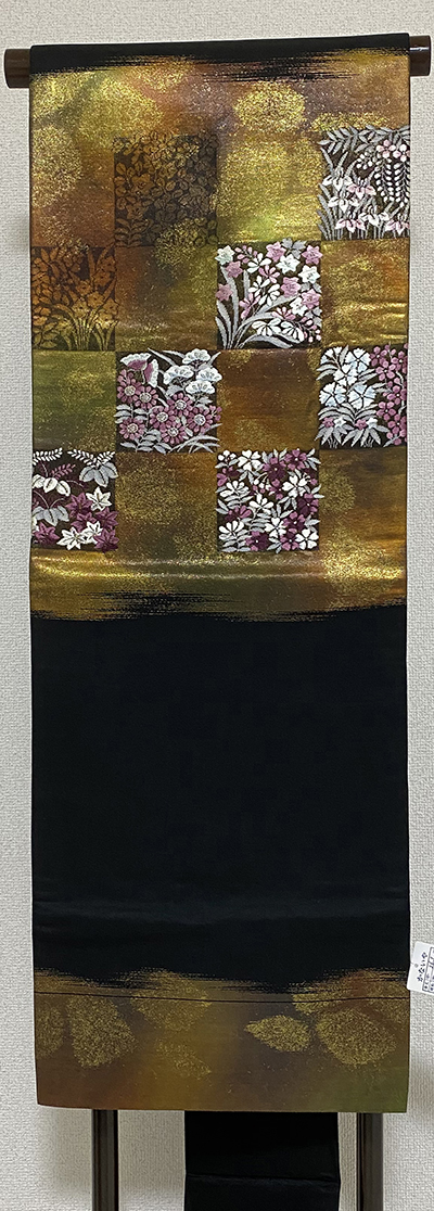 確りとした張りのある錦の織りで、黒の地織りに、お太鼓とタレに市松柄を焼き箔暈しで重ね、花柄には薄紫色や白ネズ色と銀糸を加えて織った品。