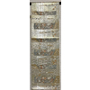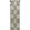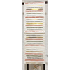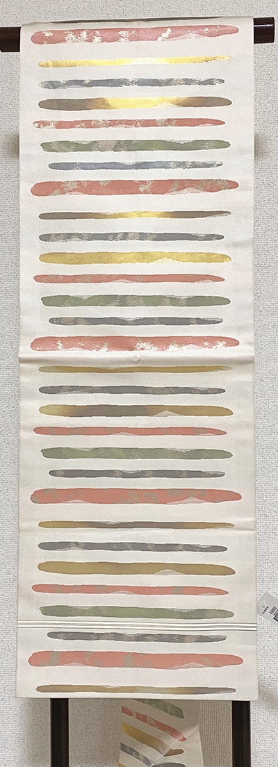 しなやかな張りのある錦の織りで、生成りの淡いベージュ色の地織りに、横段柄を金銀糸と青ネズ色に薄緑色や珊瑚色などを加え織り込んだ品。
