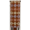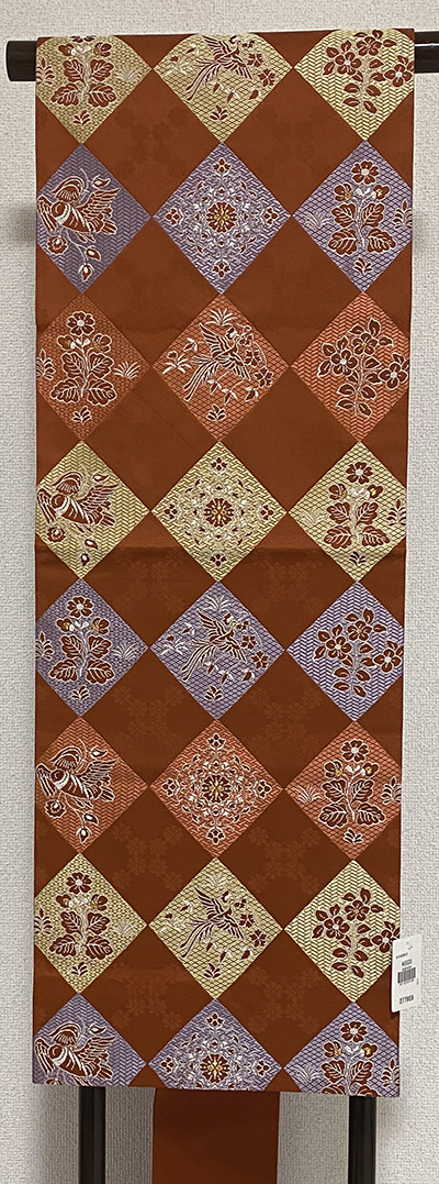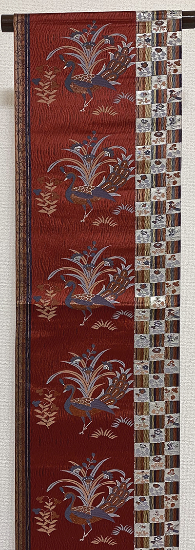 確りとした張りのある小花と市松柄を織り込んだ錦の織りで、エンジ色の地織りに、市松取り花鳥柄を青ネズ色や黄色にローズ色などにほんの少しの金糸を加えて織った、三通柄の品。