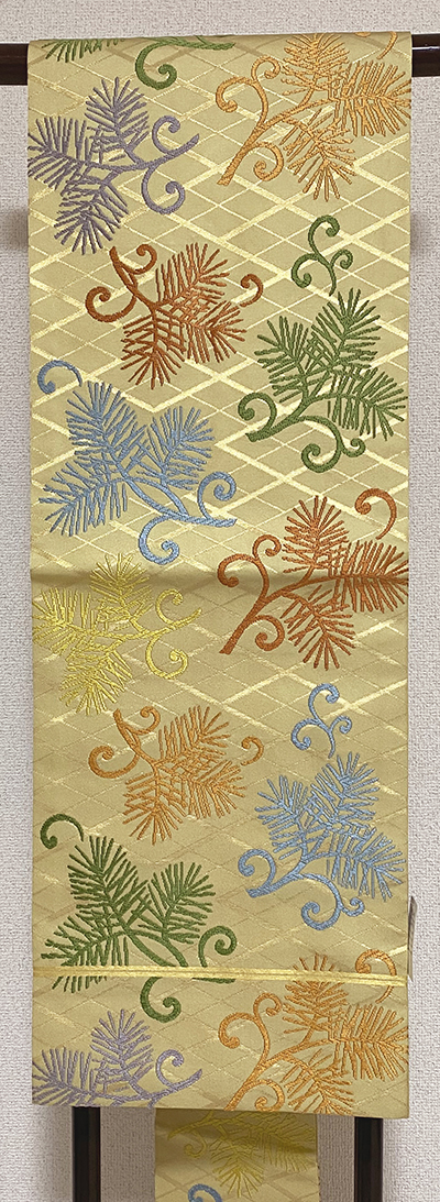 確りとした張りのある上質な川島織物らしい錦の織りで、くすんだ濃いめのベージュ色の地織りに、菱柄を金糸で織り込み、その上の松葉の柄を緑色や薄紫色に金茶色や黄赤色に水色などの唐織りでで織り上げた品。川島織物謹製、タレ返し部分に機屋マークがあります。