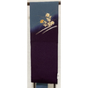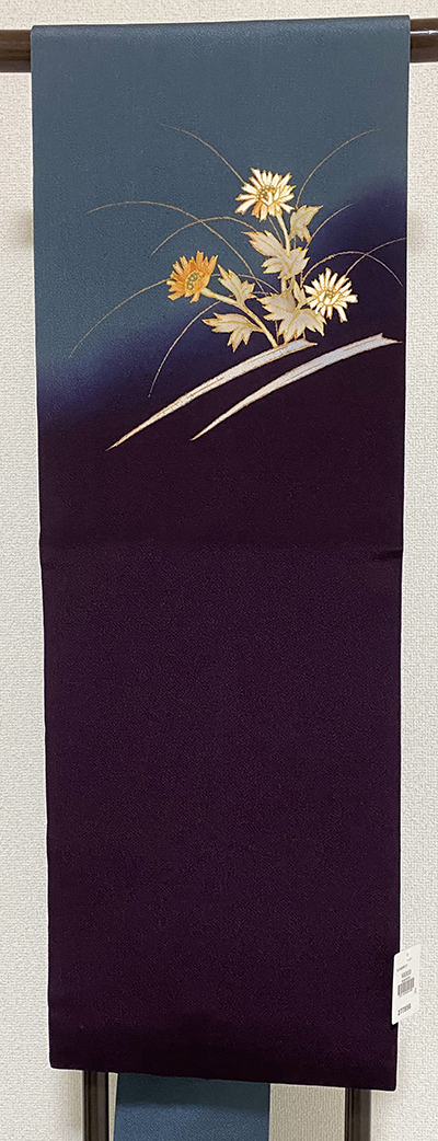 確りとした張りのある小さなシボを織り込んだ変わり一越織り生地で、お太鼓から前腹にかけてくすんだ青緑色で、お太鼓からタレにかけてくすんだ赤紫色で染め分けし、お太鼓の花柄には黄赤色や白ネズ色に染め、縁取りに金彩を加えて染めた品。