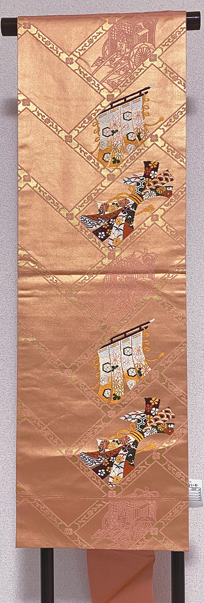 しなやかな手触りの錦の織りで、くすんだ珊瑚色に金糸を重ね、その上の大きな檜垣の柄に花柄と金箔を重ね、熨斗目や几帳の柄を黄赤色や緑色に紫色などで織った品。
