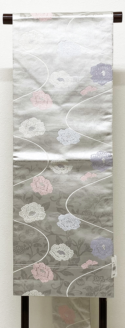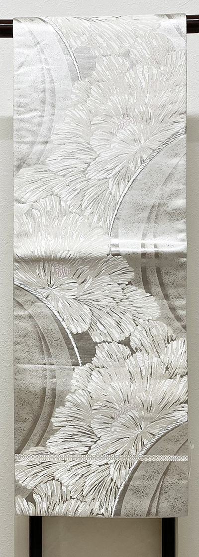 確りとした張りのある錦の織りで、生成りの白に銀糸銀箔を重ねた地織りに、白に少しの薄ピンク色を加え流水花柄を織った品。京袋仕立てで、お太鼓部分が比翼仕立てです。