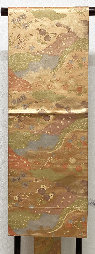 しなやかな手触りの錦の織りで、くすんだオレンジ色の地織りに、道長と花などの柄を金糸金箔とエンジ色や青とウグイス色などを加え織った品。