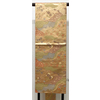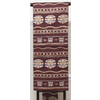 確りとした張りのあるつづれ織りの錦で、深い黄赤色の地織りに、お太鼓の大きな華紋柄を白と金糸に緑色や青紫色などで織った、手織りの品。松葉仕立て。前腹は右肩巻きの柄付けになっています。