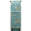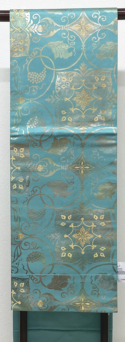 確りとした手触りの良い錦の織りで、青緑色の地織りに、蔓花柄を金糸に銀箔で織った品。手先から前腹の柄の手前までが半分に縫ってある長めの松葉仕立て。