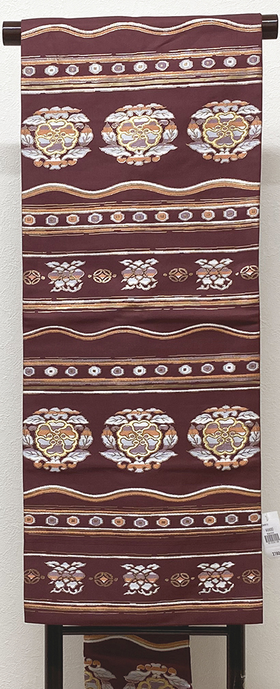 確りとした張りのある錦の織りで、深い赤紫色地織りに、横段華紋柄を金糸金箔に薄紫色や黄赤色などで織った品。