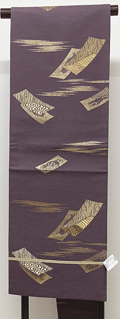 確りとした張りのあるくすんだ紫色の霜降り地織りに、短冊などの柄を金糸金箔で織った品。