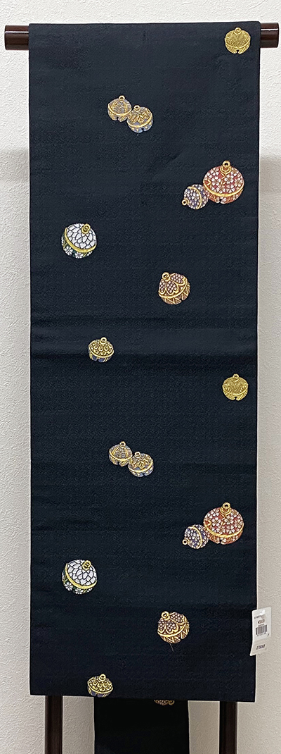 しなやかな手触りの良い錦の織りで、小さな花の地柄を織り込んだ黒の地織りに、鈴の柄を金糸と黄赤色と青ネズ色に赤紫色などで織った品。