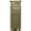 しなやかな上質な手触りの小さなフシを織り込んだ紬織り生地で、くすんだウグイス色の地織りで、前腹とお太鼓の四角取り蔓花や横線などの柄をローズ色に青色と緑色と金彩などで染めた品。