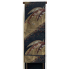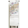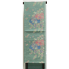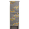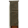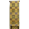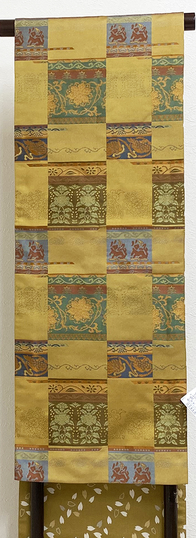 張りのある手触りの蔓花の地柄を織り込んだ油色のポリエステル紋錦の地織りに、格子取り名物裂の柄を青緑色や金茶色・鶸(ひわ)色・青ネズなどで重ね織りした品。京袋仕立て。