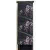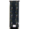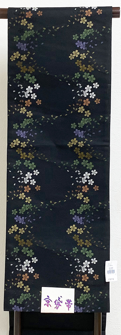 確りとした手触りの黒のポリエステル錦の地織りに、流水取り花の柄を白に緑色・金茶色・黄赤色などで重ね織りした品。京袋仕立て。