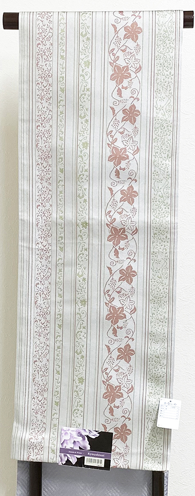 しなやかな良い手触りで銀糸を織り込んだ銀ネズ色のポリエステル錦の地織りに、細縞と蔓花の柄ををくすんだローズ色や少しの薄緑色で重ね織りした品。京袋仕立て。