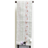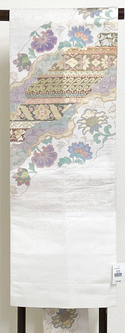 張りのある手触りの流水に花などの地柄を織り込んだ白のポリエステル錦の地織りに、お太鼓の道長取り横段華紋や蔓花などの柄を金糸とコバルトグリーン色や深緑色・ラベンダー色などで重ね織りした品。