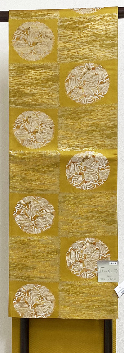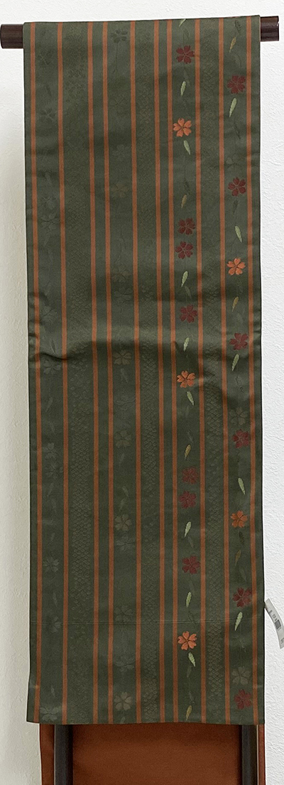 しなやかで張りのある手触りのモスグリーンに黄赤色の縞柄を織り込んだポリエステル錦の地織りに、枝垂れ桜や鹿の子の柄を地色にエンジ色などで重ね織りした品。京袋仕立て。