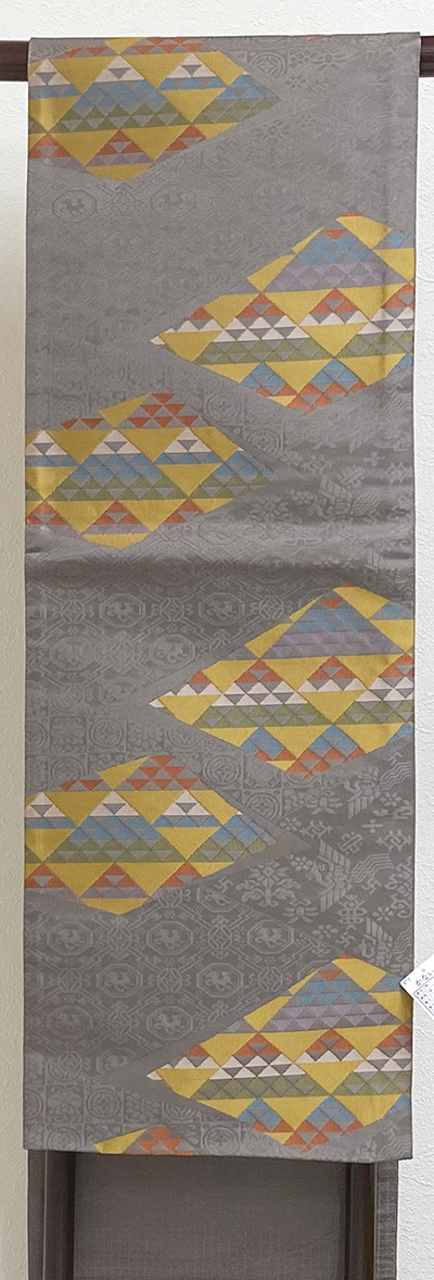 確りとした張りのある手触りのキレドリ華紋などの地柄を織り込んだ薄ネズ色のポリエステルの地織りに、ウロコ繋ぎの幾何学の柄を金茶色や黄赤色・青緑色などで重ね織りした品。京袋仕立て。