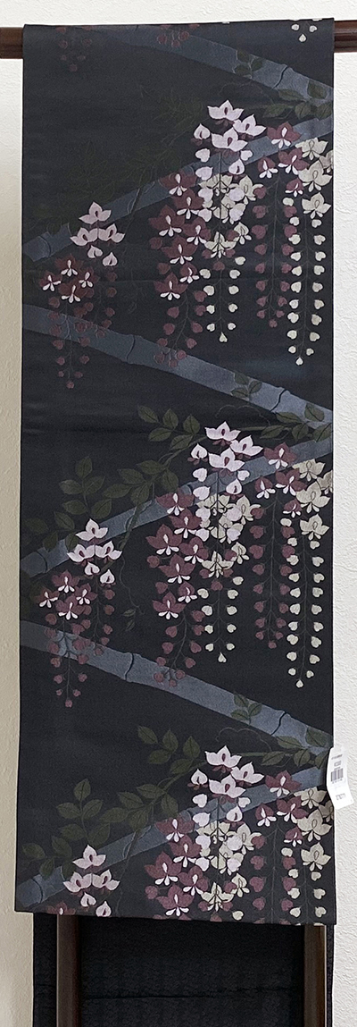 確りとした良い手触りの深い紺色を重ねた緑色のポリエステルの地織りに、藤棚の柄を銀糸と地色に白ネズと赤紫色などで重ね織りした品。京袋仕立て。